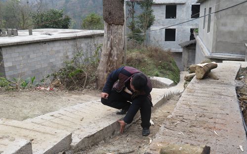 图为乡扶贫办主任、验收工作组成员杜典红正在测量毛岭村联户路厚度.