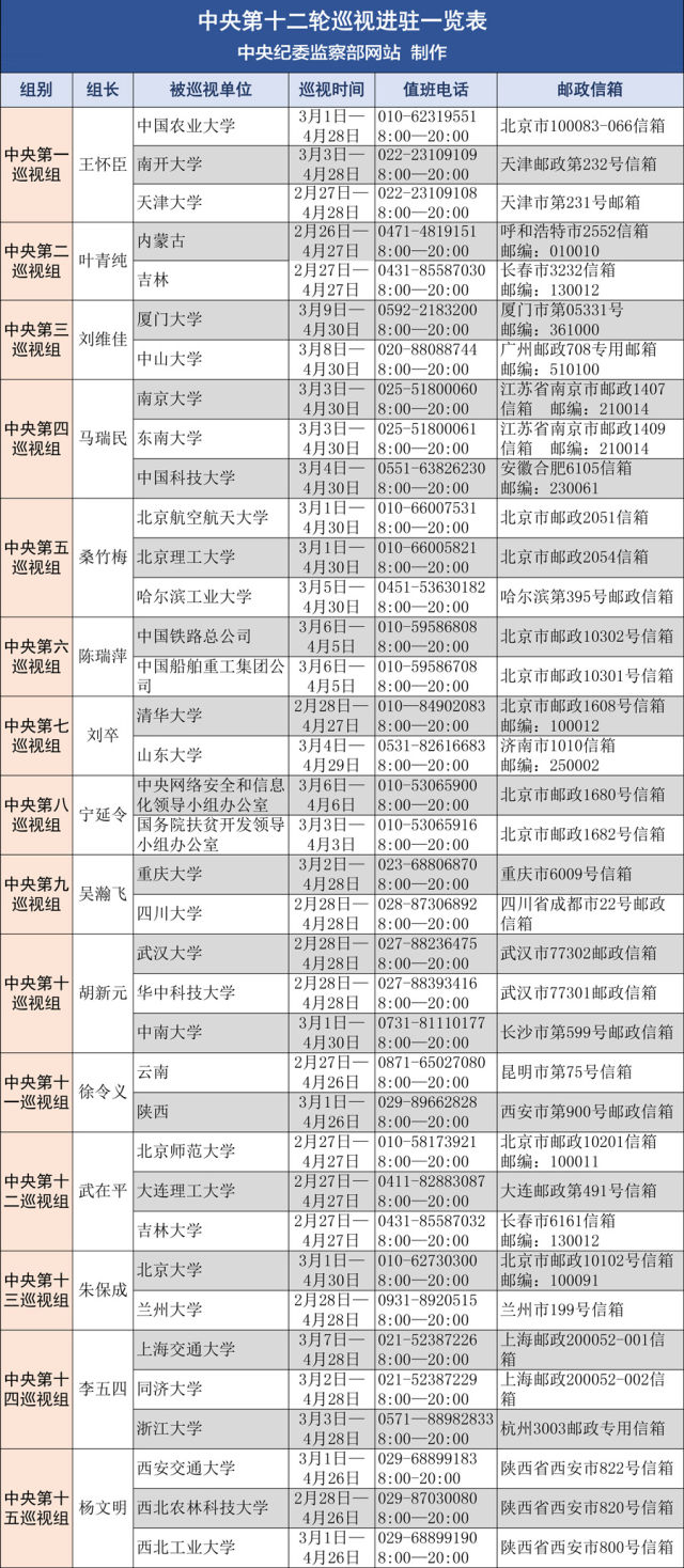 经中央批准,十八届中央第十二轮巡视对北京大学、清华大学、北京师范大学、中国农业大学、北京航空航天大学、北京理工大学、南开大学、天津大学、大连理工大学、吉林大学、哈尔滨工业大学、上海交通大学、同济大学、南京大学、东南大学、浙江大学、中国科学技术大学、厦门大学、山东大学、武汉大学、华中科技大学、中南大学、中山大学、重庆大学、四川大学、西安交通大学、西北农林科技大学、西北工业大学、兰州大学等29所中管高校党委开展专项巡视。同时,对内蒙古、吉林、云南、陕西等4个省区开展“回头看”,对中央网络安全和信息化领导小组办公室、国务院扶贫开发领导小组办公室、中国铁路总公司、中国船舶重工集团公司等4个单位试点开展“机动式”巡视。近期,中央巡视组已全部进驻上述地区和单位并召开动员会。现发布中央巡视组进驻情况,敬请关注。