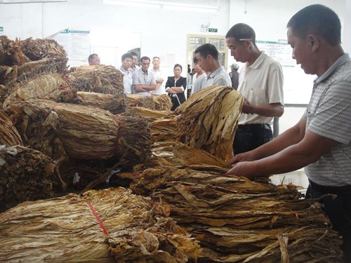 本站讯 8月21日上午,湖南省隆回县荷香桥镇泰源村刘桃园的第一筐烟叶上称,就此拉开该镇2015年烤烟收购工作序幕。荷香桥镇素称“烤烟之镇”,多年来被省市 评为烟草示范乡镇。该镇坚持实施科技兴烟战略,已连续10年出产优质烟叶超万担,烟农每年增收2000余万元。今年,该镇落实烤烟5000亩,优化烟叶产 业结构,通过培养和引进一大批有知识、懂管理、会经营的专业烟农,进行产业化种植。今年虽遭受暴雨袭击与虫灾打击,但仍有望再次超过万担。图为县烟草公司 专业人员正在检查烟叶质量。 (刘剑 贺晴 摄影报道)