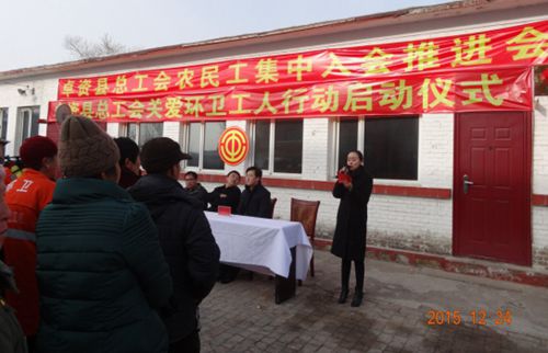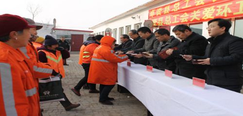 本站讯(记者李永生 通讯员宋涛)12月25日,卓资县总工会为了认真贯彻落实中央、自治区、乌兰察布市党的群团工作会议和自治区总工会与自治区人民政府第九次会议关于关爱环卫工人行动的会议精神,适时在旗下营镇拉开了“关爱环卫工人行动”活动帷幕。