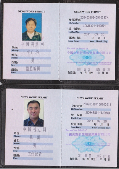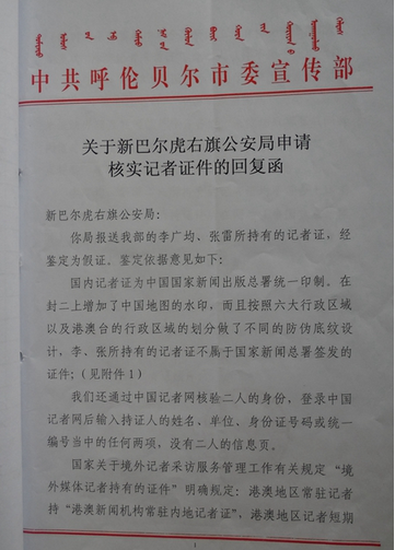 根据卷宗,被告定性李广军、张雷所持证件是假证的依据是呼伦贝尔市委宣传部《关于新巴尔虎右旗公安局申请核实记者证件的回复函》。这份《回复函》称: “李、张所持有的记者证不属于国家新闻出版总署签发的证件”。“我们还通过中国记者网核验二人的身份,登录中国记者网后输入持证人的姓名、单位、身份证号 码或统一编号当中的任何两项,没有二人的信息页”;“国家关于境外记者采访服务管理工作有关规定‘境外媒体记者持有的证件’明确规定:港澳地区常驻记者持 ‘港澳新闻机构常驻内地记者证’,港澳地区记者短期(临时)采访需持中华全国新闻工作者协会(中国记协)制发的‘港澳记者采访证’。此二人证件不属于此类 证件。今年6月2 8日,国信办关闭了‘中国焦点新闻网’在内的3 1家非法网站。‘中国焦点新闻网’为个人主办,未依法办理互联网信息服务备案,未依法取得互联网新闻信息服务资质,属非法网站”;“李广均、张雷二人所持 有的记者证均不符合上述正规持证资质,同时其所持证件所在网站(中国焦点新闻网)已被国家认定为非法网站,因而鉴定二人的记者证为假证、二人的记者身份为 假冒记者。”