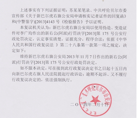 张雷、李广军被释放后,很快就向呼伦贝尔市公安局提出行政复议申请书,呼伦贝尔市公安局随后做出了呼公复决字(2013)第80号、第81号行政复议决定书,维持了新右旗新右公(阿派)行罚决字(2013)第175号、第176号行政处罚决定书。