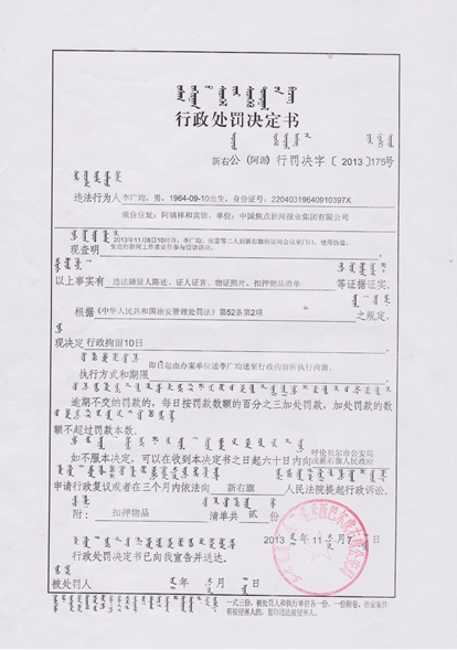 11月7日,阿拉坦额莫勒镇第一派出所以涉嫌“使用工作证件不实”为由,传唤了张雷和李广军。同日,办案人不顾二人的申辩,分别对张雷和李广军作出行 政拘留10天的行政处罚决定,并即刻强制执行,拘留的理由是“使用伪造、变造工作证件参与信访活动”。在张雷、李广军被强制行政拘留期间,警方拒绝家属探 望,拒绝会见律师,拒绝任何亲朋探视,并多次对二人进行提审。经过十天的审查,新右旗警方没有查出来任何问题后,不得不将此二人释放。