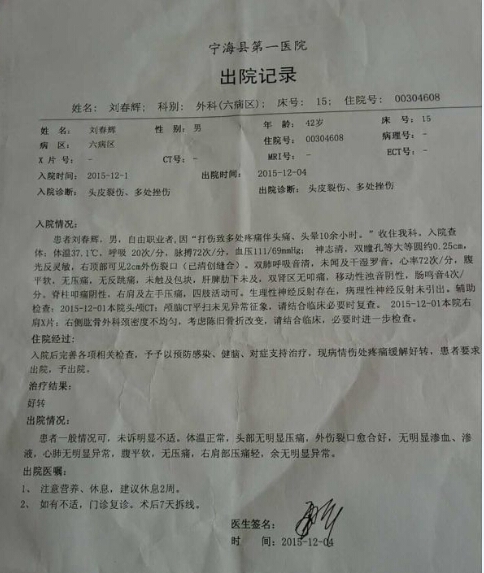 刘春辉说:从事情发生到现在,派出所一直不处理,还说他们四人中有人脸部受伤,如果我不就此罢休就让对方验伤,就把我抓起来!他们四人手持凶器冲进我家, 我毫无防备直接就被打伤了,而且李忠诚还抱住我,我根本没有还手余地,周围商家及邻居听到打砸哭喊声后都起来目睹了事情经过。