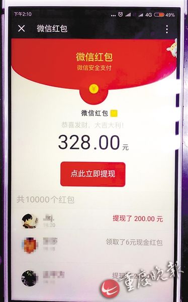 虽然不知道谁发的,但这个红包和普通微信红包界面一模一样。李先生毫不设防,点开了红包,里面有328元。红包提示“点此立即提现”,同时显示其他网友已经提现几元到几百元不等。