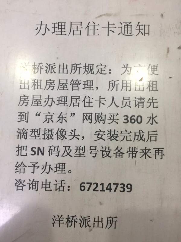 薛女士提供的现场照片上,可以看到一份名为“办理居住卡通知”。其中这样表述:洋桥派出所规定,为方便出租房屋管理,所用(有)出租房屋办理居住卡人员请先到京东网购360水滴型摄像头,安装完成后,把SN码及型号设备带来,再给予办理。后面所附的咨询电话,正是洋桥派出所的办公电话。