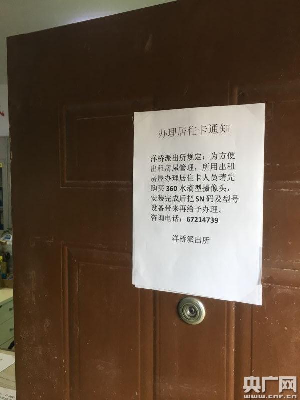 在洋桥派出所户籍室,一位女民警看到这份通知,有些诧异。但另一位男性民警说,有这样的规定。“现在房主都让装探头,属于技术防范措施。建议租户都安装,360的这个相对便宜,好像100多块钱。具体怎么操作可以问居委会。”