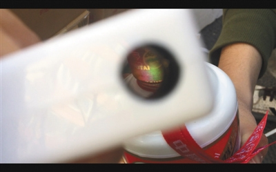 2月25日,记者拆开张建的假茅台酒检测真伪,结果显示瓶盖处有彩条(根据说明书提示,此为正品包装的特征,但记者所检测的茅台酒实际为假茅台酒)。