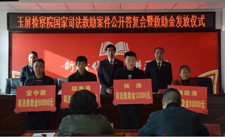 本站讯 贵州省玉屏侗族自治县人民检察院紧紧围绕“不忘初心、牢记使命”主题教育,立足检察职能,于2019年12月10日,该院举行了国家司法救助案件公开答复会暨司法救助金发放仪式。会议邀请了部分县人大代表、政协委员、律师代表参会。
