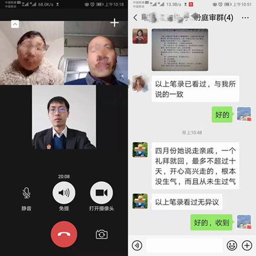 2月11日上午,河南省叶县法院任店法庭庭长张旗巧妙利用微信视频方式对一起离婚纠纷案件进行远程调解,办案人员通过微信视频对原被告进行了身份信息确认,双方当事人充分发表了各自观点,并出示了各自的证据、质证,同时双方展开视频辩论。最终在办案人员细心耐心的调解下,双方当事人达成一致意见同意调解,并将视频和聊天记录内容作为调解案件的主要依据,原被告双方在线对调解笔录和调解协议进行核对确认,最终该案成功调解。
