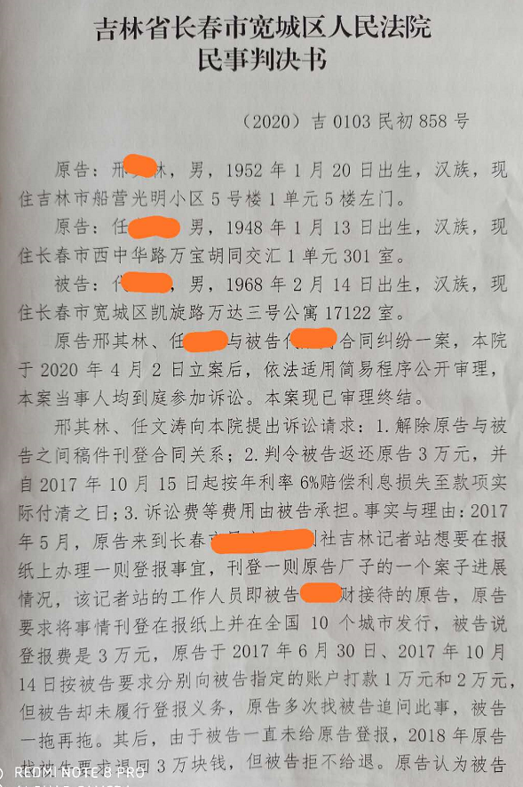 2020年6月3日下午5点,代某某接到了宽城区人民法院作出的(2020)吉0103民初858号《民事判决书》。