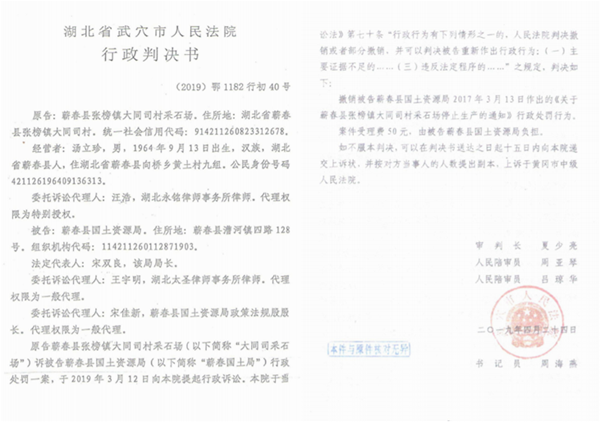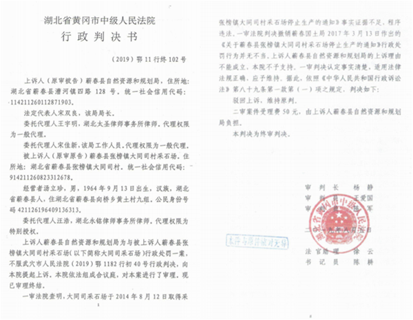 2019年4月24日,武穴市人民法院同日作出(2019) 鄂1182行初39号、40号两份行政判决书,判决被告蕲春县国土资源局在本判决生效后10日内对采石场提出的采矿权延续申请重新作出行政行\为;判决撤销被告蕲春县国土资源局2017年3月13日对采石场作出的停止生产通知。