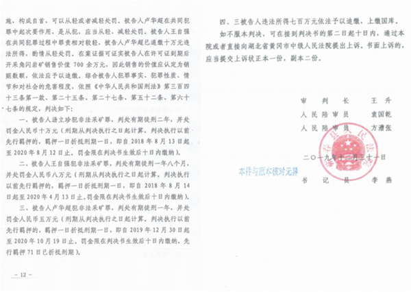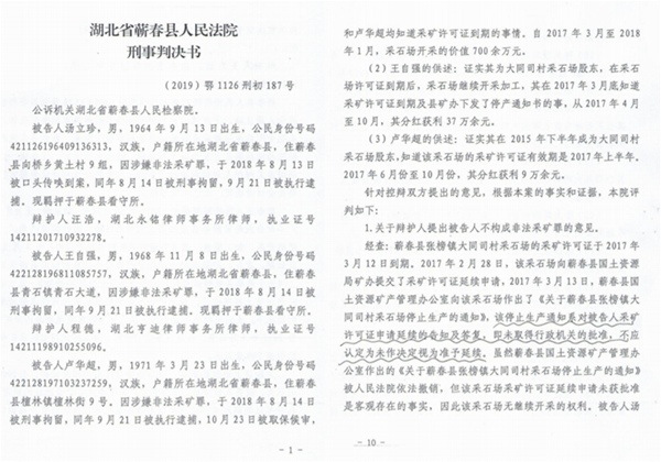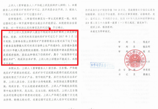 2019年12月31日,关于汤立珍三人构成非法采矿罪的刑事判决书,在蕲春县人民法院毫无悬念地判下来了。汤立珍三人不服,上诉至黄冈市中级人民法院,黄冈市中级人民法院作出(2020)鄂11刑终48号刑事裁定书,驳回上诉,维持原判。