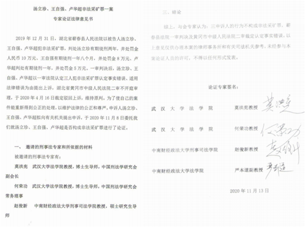 2020年11月13日,在中南财经政法大学刑事司法学院会议室,与会专家对于汤立珍三人提供的上述材料进行了充分的分析研究,形成一致意见:三申诉人的行为不构成非法采矿罪,蕲春县法院一审判决及黄冈市中级人民法院二审裁定认定事实错误。