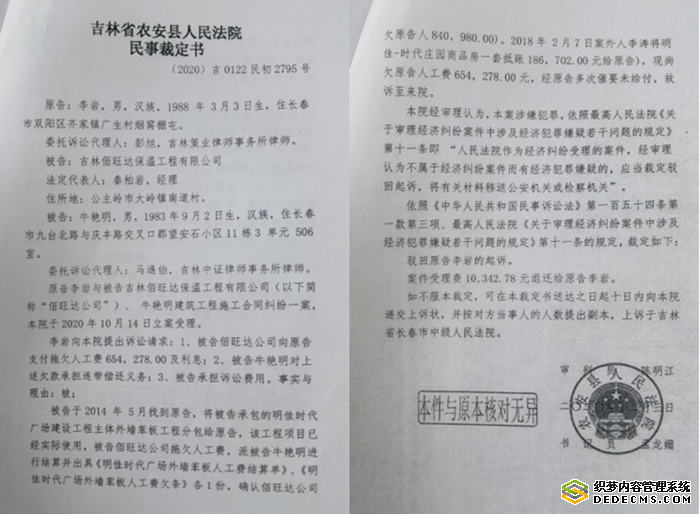 2020年12月3日,农安县人民法院作出(2020)吉0122民初2795号民事裁定书,认定牛艳明所持公章系私刻,且不存在“外墙苯板工程”,以“本案涉嫌犯罪”裁定驳回起诉。