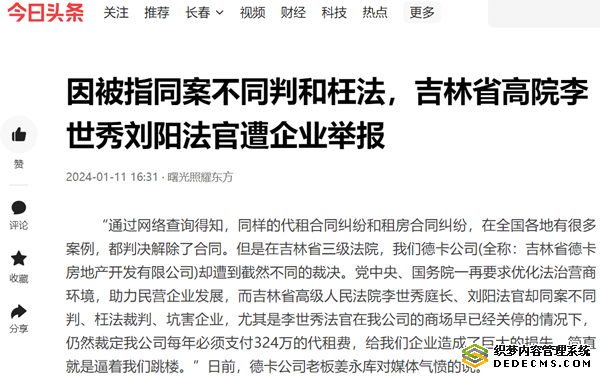 “通过网络查询得知,同样的代租合同纠纷和租房合同纠纷,在全国各地有很多案例,都判决解除了合同。但是在吉林省三级法院,我们德卡公司(全称:吉林省德卡房地产开发有限公司)却遭到截然不同的裁决。党中央、国务院一再要求优化法治营商环境,助力民营企业发展,而吉林省高级人民法院李世秀庭长、刘阳法官却同案不同判、枉法裁判、坑害企业,尤其是李世秀法官在我公司的商场早已经关停的情况下,仍然裁定我公司每年必须支付324万的代租费,给我们企业造成了巨大的损失,简直就是逼着我们跳楼。”日前,德卡公司老板姜永库对媒体气愤的说。