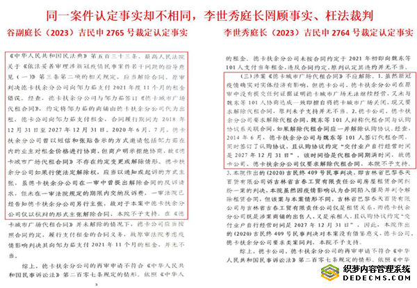 李世秀庭长承办另外的101户,德卡公司已提出反诉解除代租合同,李世秀庭长认定的事实却截然相反。2023年10月25日,吉林省高级人民法院(2023)吉民申2764号民事裁定书第19页称:“本院经审查认为:(三)案涉《德卡城市广场代租合同》不应解除”1、虽然新冠疫情确实对实体经济有影响,但德卡公司、德卡扶余分公司在原审中没有提交任何证据证明德卡城市广场无法继续经营,又未与魏东等101人协商大成一致即擅自将德卡城市广场关闭,现又要求解除代租合同,原审判决未予支持并无不当。2、德卡公司,德卡扶余分公司要求解除代租合同,魏东等101人辩称,代租合同与认购协议系关联合同,如解除代租合同应一并解除认购协议。经查,2014年6月,德卡扶余分公司与魏东等101人签订代租合同,同时签订了认购协议,且认购协议约定“交付业户自行经营时间是2027年12月31日”,该时间恰是代租合同期满时间,故德卡公司、德卡分公司仅要求解除代租合同,本院不予支持。”