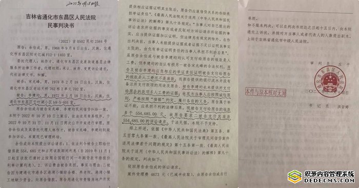 余伯成拿出了通化市东昌区法院作出(2022)吉0502民初2584号民事判决书,说法院已经认定554685元是房款,不是人工费。王彩霞坚称,不修改诉讼标的就不予立案。