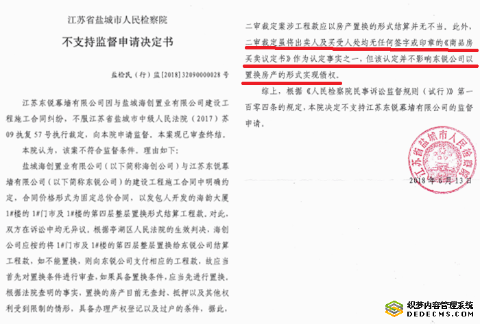 2018年3月,江苏省盐城市检察院盐检民(行)监【2018】32090000028号不支持监督申请决定书第二页则称:“二审裁定虽将出卖人与买受人均无任何签订或印章的《商品房买卖议定书》作为认定事实之一......”.据此,可以认定此合同为空白合同,法官王珩在执行案中造假。