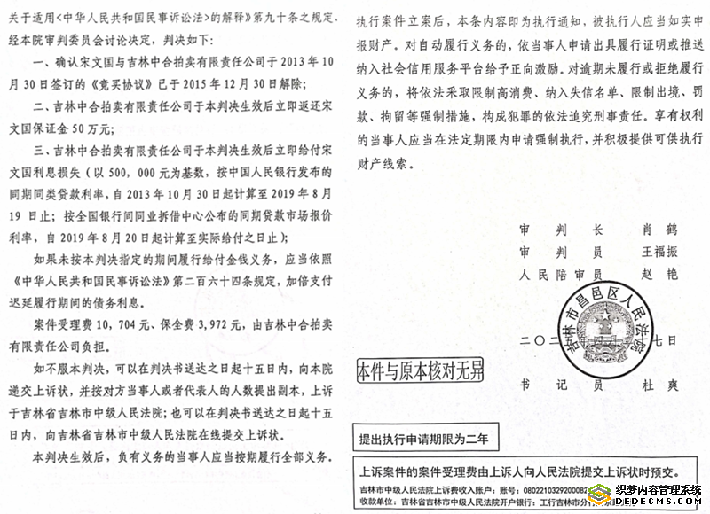 其二,审限严重超期,“内部请示”沦为程序违法挡箭牌。根据《民事诉讼法》规定,普通民事案件一审审限最长不超过9个月,但本案一审审限长达一年多。中合拍卖就此质疑时,法院竟以“需向中院请示、中院人员变动导致暂缓”为由搪塞。而吉林市中级法院在审理中,未对一审超期审理的程序违法问题予以纠正,反而维持了存在程序瑕疵的一审判决,违背了“程序正义是实体公正前提”的司法原则。中合拍卖因此认为,一审与二审其实是早就串通好了的,涉嫌程序违法。
