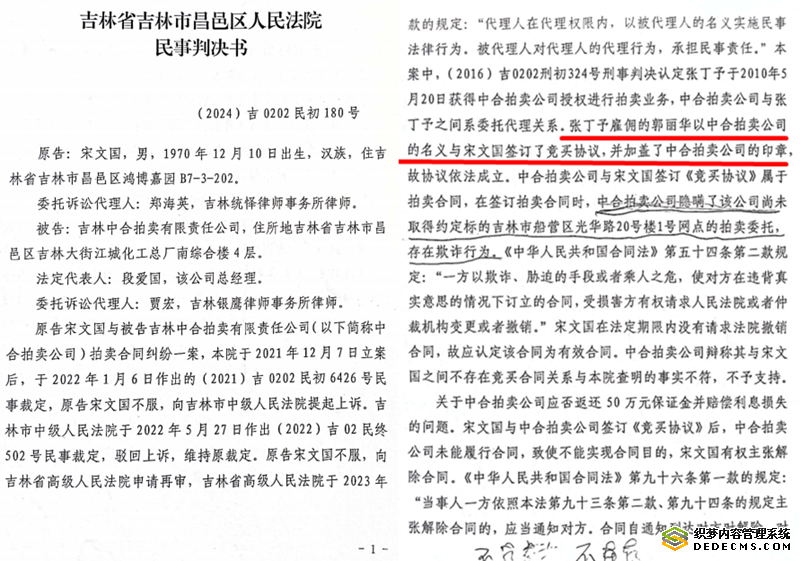 这起引发争议的案件,核心围绕一份虚构的拍卖协议展开。据吉林市昌邑区法院(2024)0202民初180号民事判决书记载:2013年10月30日,宋文国与自称吉林中合拍卖有限责任公司(下称“中合拍卖”)会计的郭丽华签订《竞买协议》,约定拍卖吉林市船营区一处网点,宋文国预交50万元保证金至郭丽华个人账户。中合拍卖始终坚称,该协议系张丁予、郭丽华冒用公司名义伪造,款项亦流入二人个人账户,本质是刑事诈骗,与公司无任何关联。