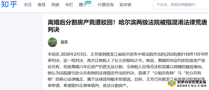 本站讯 2026年2月3日,王芳接到黑龙江省哈尔滨市中级法院作出的(2026)黑01民终155号终审判决,这一纸判决,再次让她陷入了长久的郁闷之中。她说,离婚时协议约定的是房产按份共有,但是离婚六年后房产仍然无法分割,令她陷入自身合法权益难以保障的尴尬境地。她认为法院援引处分共有物的法律规定作出的判决,混淆了“分割共有物”与“处分共有物”的核心法律概念,属于法律适用根本性错误。目前,王芳已向黑龙江省高级法院提起再审申请,希望能纠正原审错判,依法分割房产。