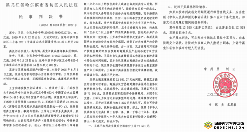 目前,王芳已向黑龙江省高级法院提交再审申请书,提出三项核心请求:依法撤销香坊区法院(2025)黑0110民初11827号民事判决第二项及诉讼费相关判决,撤销哈尔滨市中级法院(2026)黑01民终155号判决,依法将该案发回重审或直接改判。同时,王芳还请求再审法院按照《民法典》规定,以实物分割、折价分割或变价分割的方式,对案涉按份共有房产作出分割裁判,并由王琢承担本案一、二审的诉讼费用。