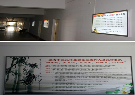 “纪检监察干部‘六要六不要’,啊啊‘算好人生七笔帐、走好人生每一步’”……走进察右中旗任何一个角落,一幅幅图文并茂的廉政宣传画面争相跃入大众眼 帘,同时再配以抵制腐败,催人奋进的警言格句,颇给人一种耐人寻味的反思,最大化地让广大党员干部在工作中潜移默化地融入到廉政文化教育中。