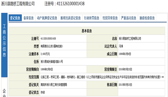 本网登陆河南省工商局全国企业信用信息公示系统查询看到,淅川县路桥工程有限公司成立于1999年2月8日,注册号为:411326100001438,公司类型为:有限责任公司(国有控股),注册资本为:3600万元,地址为:淅川县城关镇灌河路11号,经营范围为:公路工程、桥梁工程、道路、地坪硬化和施工维修等,自然人股东有:蔡学武、王国涛、刘峰及赵堤,法定代表人、执行董事及总经理为:冯涛。