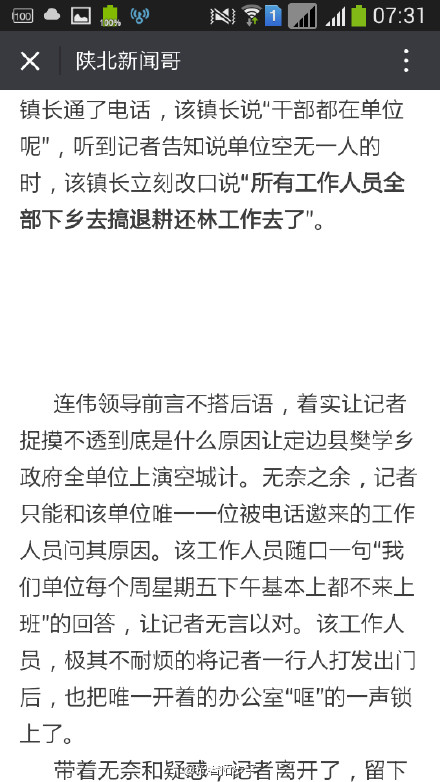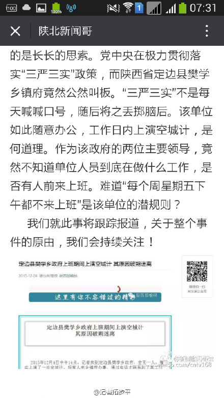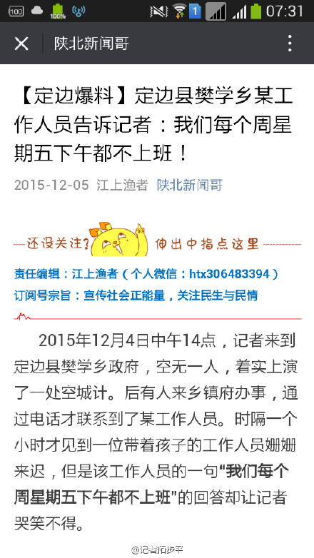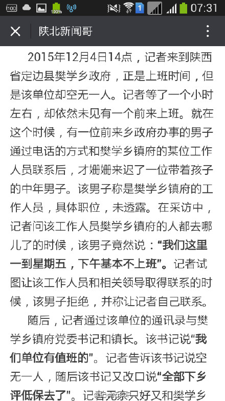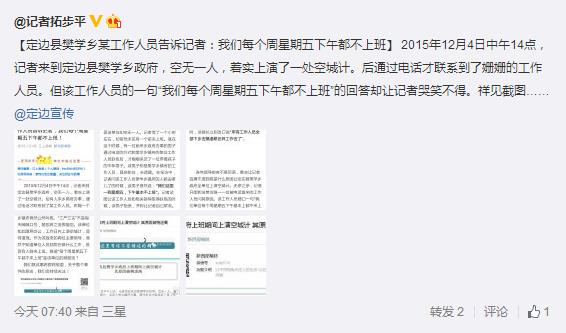 2015年12月4日中午14点,记者来到定边县樊学乡政府,空无一人,着实上演了一处空城计。后通过电话才联系到了姗姗的工作人员。但该工作人员的一句“我们每个周星期五下午都不上班”的回答却让记者哭笑不得。详见截图……