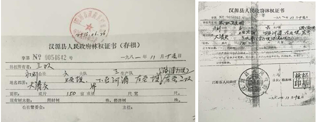 图注:同一编号的林权证书,盖有汉源县人民政府印章一份明显有添加、涂改的痕迹。