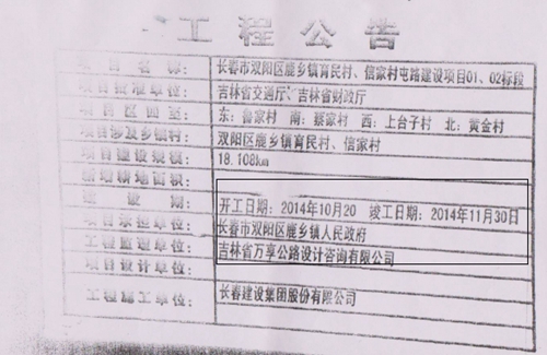 据施工方绍立新讲:长春市双阳区鹿乡镇“村村通”《工程公告》及招标公告后,许多施工方跃跃欲试,其中,有两家施工单位到现场考察,发现《公告》中两个标段工程竣工已经通车。