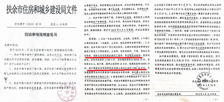 ——上诉人所举2016年的房产证及2019年的不动产登记可以证明,从上诉人处购买商铺的购买人在2016年和2019年已经办理3户产权证照或不动产登记证,至于有时不能办理产权登记或不动产登记的原因则是政府职能部门不作为甚至违法行政造成的。扶余市政府扶住建字(2019)69号信访事项处理意见书的答复说德卡公司商业部分未验收和德卡公司欠土地出让金1980万元,超建筑面积6万多平方,这是虚假证明。真实的情况是:德卡新城商业部分消防早在2017年2月27日就已验收完毕,而出让金上诉人也并不欠缴。德卡公司的土地使用权出让合同、建设工程规划许可证、扶余市发展和改革局文件[2015]88号)的批复是一致的,都是122900平方米,以上两份政府文件均证明德卡公司没有超建筑总面积。