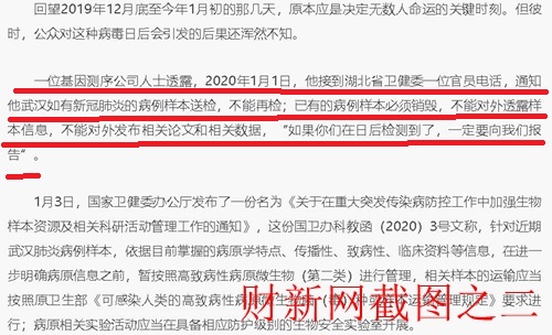 一位基因测序公司人士透露,2020年1月1日,他接到湖北省卫健委一位官员电话,通知他武汉如有新冠肺炎的病例样本送检,不能再检;已有的病例样本必须销毁,不能对外透露样本信息,不能对外发布相关论文和相关数据,“如果你们在日后检测到了,一定要向我们报告”。