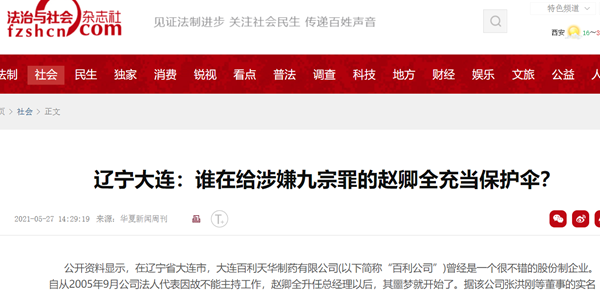 公开资料显示,在辽宁省大连市,大连百利天华制药有限公司(以下简称“百利公司”)曾经是一个很不错的股份制企业。自从2005年9月公司法人代表因故不能主持工作,赵卿全升任总经理以后,其噩梦就开始了。据该公司张洪刚等董事的实名举报:赵卿全通过造假、与他人恶意串通、虚构债权和虚假诉讼等手段,不断侵吞公司财产,最终导致百利公司破产!令他们不解的和不能接受的是,警方经过多年的侦查,已经掌握了其大量犯罪证据,但是至今赵卿全仍然逍遥法外,在赵卿全大肆侵吞百利公司财产的背后,有着强大的保护伞为其撑腰!