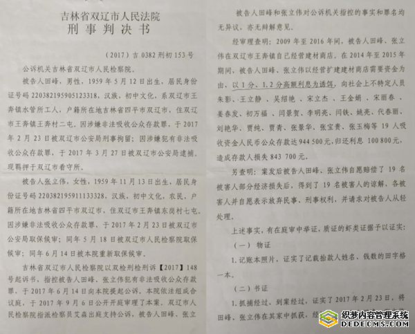 双辽市法院做出的(2017)吉0382刑初153号刑事判决书称:“被告人田峰和张立伟对公诉机关指控的事实和罪名均无异议,亦无辩解意见。经审理查明:2009年至2016年间,被告人田峰、张立伟在双辽市王奔镇自己经营建材商店。在2014年至2015年期间,被告人田峰、张立伟以经营扩建建材商店需要资金为由,以1分、1.2分高额利息为诱饵,向社会上不特定人员朱影、王立静、吴绍艳、宋立杰、王金娟、宋丽春、姜春发、初万福、闫景贺、李明亮、闫铁、姚亮、代春丽、刘艳华、贾纯、贾青、张景华、张宝贵、张玉梅等19人吸收资金人民币公众存款达944500元,归还利息100800元,造成存款人损失843700元。