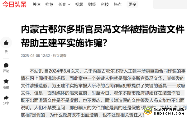 本站讯 自2024年6月以来,关于内蒙古鄂尔多斯人王建平涉嫌巨额合同诈骗的事情在网上闹得沸沸扬扬,而此案中一个关键人物就是鄂尔多斯官员冯文华,其签发的文件涉嫌造假,为王建平实施举报人所称的合同诈骗犯罪提供了关键的道具——政府文件。但是,面对媒体的滔天巨浪,时至今日,鄂尔多斯市政府却始终在装聋作哑,既不出面澄清文件是不是虚假,也不表态。而涉嫌造假的文件签发人冯文华也不出面说明。人们不禁要追问,那份骗人的文件到底是真的还是假的?是真的,为什么查不到底档?是假的,为什么政府既不出面澄清,也不处理相关责任人?