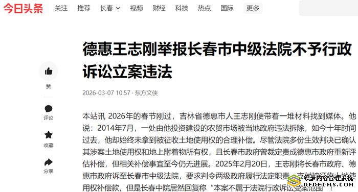 本站讯 2026年的春节刚过,吉林省德惠市人王志刚便带着一堆材料找到媒体。他说:2014年7月,一处由他投资建设的农贸市场被当地政府违法拆除,如今十年时间过去,他却始终未拿到被征收土地使用权的合理补偿。尽管法院多份生效判决已确认其涉案土地使用权和地上附着物所有权,且长春市政府曾裁定责成德惠市政府重新评估补偿,但相关补偿事宜至今仍无进展。2025年2月20日,王志刚将长春市政府、德惠市政府诉至长春市中级法院,要求判令两级政府履行法定职责,支付被征收土地使用权补偿款,但是长春中院居然回复称“本案不属于法院行政诉讼受案范围”!