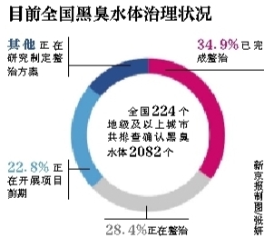 截至目前,全国224个地级及以上城市共排查确认黑臭水体2082个,其中34.9%已完成整治,28.4%正在整治,22.8%正在开展项目前期,其他正在研究制定整治方案。据悉,2016年2月18日首次公开的全国城市建成区黑臭水体清单列出的水体总数是1861条。