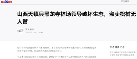 于是本刊派出记者前往调查采访。2019年11月1日本刊记者来到山西大同市天镇县黑龙寺林场见到了知情人,当地知情人告知记者,黑龙寺林场的部分松树被林场领导盗挖,这些被盗挖的松树都是20多的年龄,六米高的松树,每棵松树的市场价是两千元多元,林场主要领导和树贩子合作把这些高龄松树送往内蒙古等地绿化。