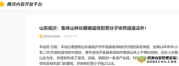 本站讯 日前,本站记者接到山东省临沂市平邑县老邱峪村村民的实名举报,反映以林本华(小名二华)为首的盗伐树木团伙,常年盗伐平邑县老邱峪村南部山林上千棵松柏树。这伙人长期以此为生,并逐渐形成了盗伐、运输、销赃的一条龙产业链,村民们希望通过媒体报道引起领导及相关部门的重视,尽快将犯罪分子绳之以法。