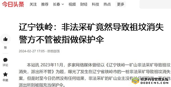 本站讯 2023年11月,多家网络媒体曾经以《辽宁铁岭一矿山非法采矿导致祖坟消失,派出所不管》为题,曝光了发生在辽宁省铁岭市的一桩非法采矿导致祖坟消失案,但是时至今日仍然没有任何结果,非法采矿的矿山业主没有给任何赔偿,而当地派出所则被指充当保护伞。
