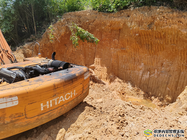 7月19日时近中午,在工地西北角山脚下停着一台大型铲车,铲车处就是一个被挖出约有12米×9米×6米的大坑,山体部分沙土已经外运,场地上还有新铲挖的沙土囤积,深坑底部渗出水来,而被开山挖土的这座小山背部就是一片茶园。据附近散步的居民讲:“按照这个开山挖土进度,这座背负茶园的小山很快将被铲挖成支离破碎。”