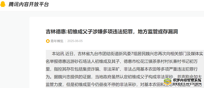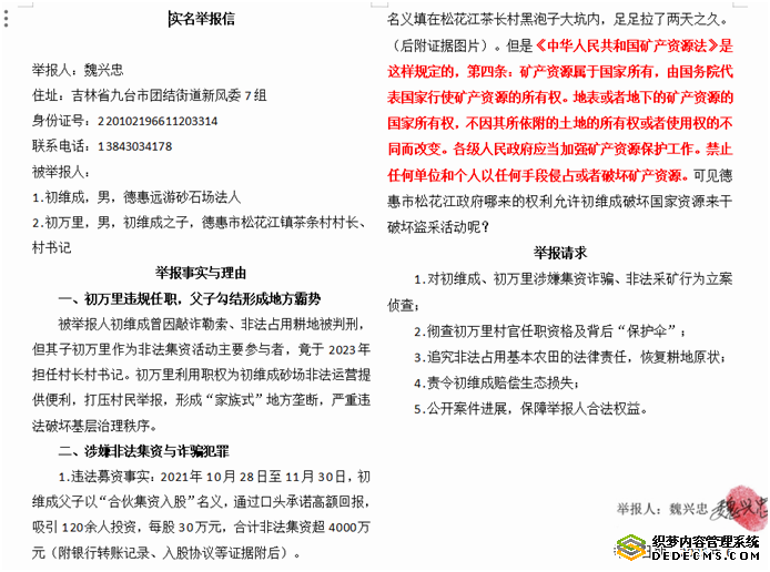 本站讯 近日,吉林省九台市团结街道新风委7组居民魏兴忠再次向相关部门及媒体实名举报德惠远游砂石场法人初维成及其子、德惠市松花江镇茶条村村长兼村书记初万里,指控其存在包括集资诈骗、非法采矿、非法占用基本农田等多项严重违法犯罪行为。据魏兴忠提供的证据,当地政府虽然认定初维成父子构成非法采砂,并声称会加大监管力度,但是初维成至今仍昼夜不停的非法采砂,对基本农田和生态环境造成严重的破坏。