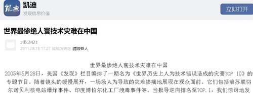 2005年5月28日,美国《发现》栏目编排了一期名为《世界历史上人为技术错误造成的灾害TOP 10》的专题节目。随着镜头的缓慢展开,一场场人为导致的灾难惨痛地展现在观众面前。它们包括前苏联切尔诺贝利核电站爆炸事件、印度博怕尔化工厂洩毒事件等。当报导逆向排名至TOP.1,我们惊讶地发现:世界历史上最惨绝人寰的人为灾难,居然发生在中国!