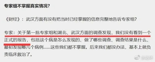 然后,相继有专家出来甩锅,指控湖北武汉主事人是疫情的罪魁祸首,而且他们不是偶然和无意犯错,而是蓄意隐瞒。武汉市为了当地的稳定发展大局,压制地方医院的上报,对国家卫健委隐瞒真相;在国家卫健委专家组来访时,用集体忽悠、表演和蒙骗的方式,让专家们一无所获,得到个“没有人传人”的结论;直到第三批专家组来,眼看事情捂不住了,联合央视披露信息,制造自己先前已披露的假相。