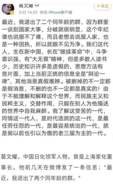 今天看到朋友圈转的一个文章,前上海家化的董事长葛文耀退出了老朋友的群,详见下面的截图。