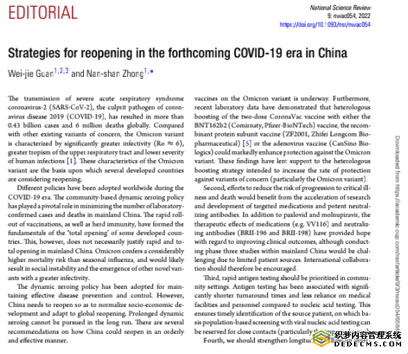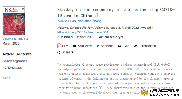 3月以来,上海市民挣扎于这波来势汹汹的新冠疫情,全国多地疫情也悄然反弹。每天我们醒来打开手机,入眼都是:新增确诊多少例,无症状感染者多少例...。仅上海地区确诊和无症状感染者就超过了30多万。 重压之下,不同的声音也多了起来,有人坚持动态清零,有人说不如直接开放共存,也有人将目光投向专家们,等待他们发声。 2022年4月6日,钟南山与关伟杰在《国家科技评论》(National Science Review, NSR)上发表了文章,钟南山表示, 现阶段我们仍需要坚持动态清零,但想要长久地实现动态清零很难,我们需要为了社会、经济的正常发展考虑逐步重新开放,并对此提出了五点建议。