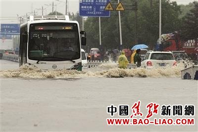 昨天,一辆公交车经过常州市积水路段。陈暐 摄