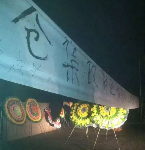 胡家人在仓集镇政府门口拉横幅、摆花圈,静坐“喊冤”
